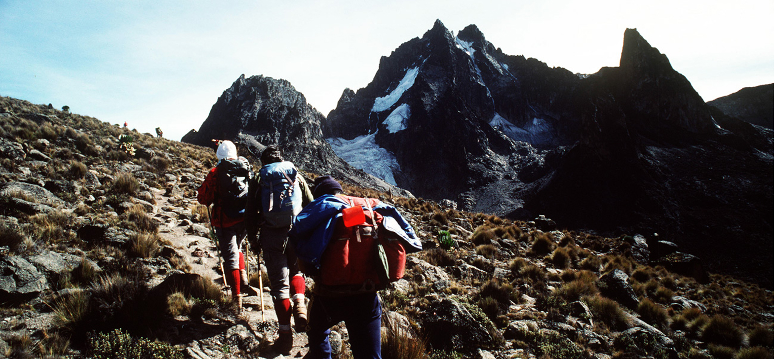 D4 Details: Trek to the base of the high peaks then take summit circuit trail in the clockwise direction, with amazing views of the jagged volcanic peaks and glaciers. Our target is to get to Shipton's Mountain Hut/Camp located in the Mackinder's valley. From the camp we have a panoramic view of all the main peaks including Terere and Sendeyo two ancient parasitic vents of the main peaks. Climbing high (Hausberg Col) and sleeping low (Shipton's) is excellent for acclimatisation.